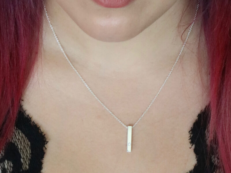$110.00Sterling silver ring with horizontal tube bar ending in cubic zirconia stones at each end. Hand made to order. Pick your size and stone color.